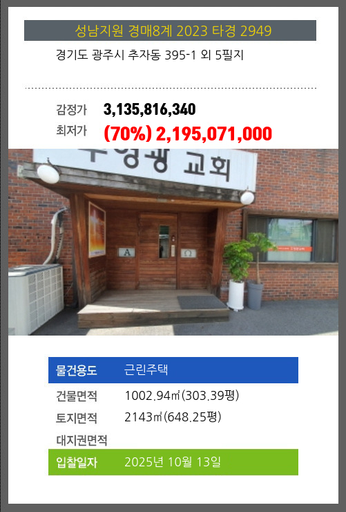 | 건물면적 | 1002.94㎡ (303.39평) | 채무자 | 이** | 최저가 | (70%) 2,195,071,000 |