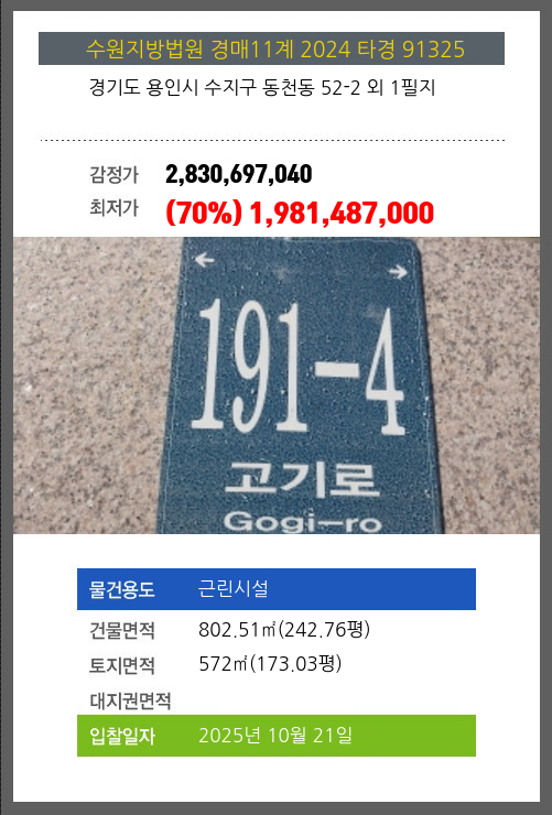 용인시설경매 용인시 수지구 동천동 52-2 외 1필지 №2024 타경 91325