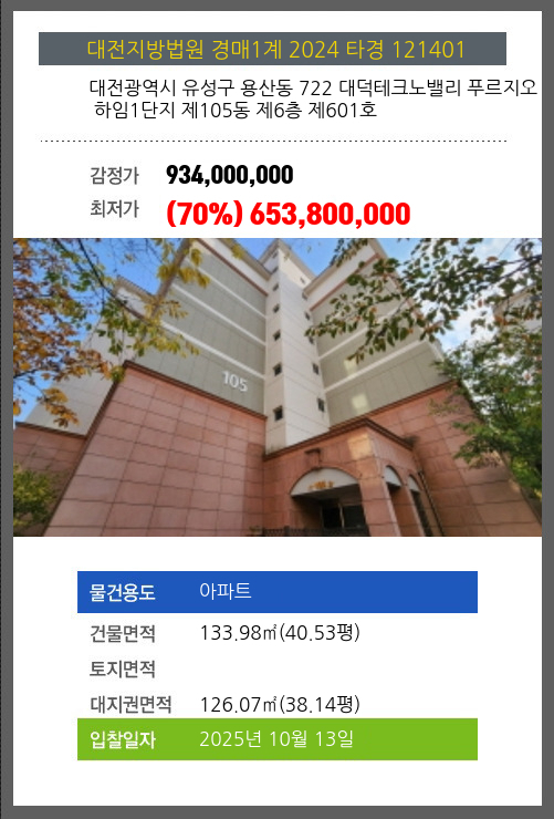 본건은 대전광역시 유성구 용산동 722 대덕테크노밸리 푸르지오 하임1단지 제105동 제6층 제601호