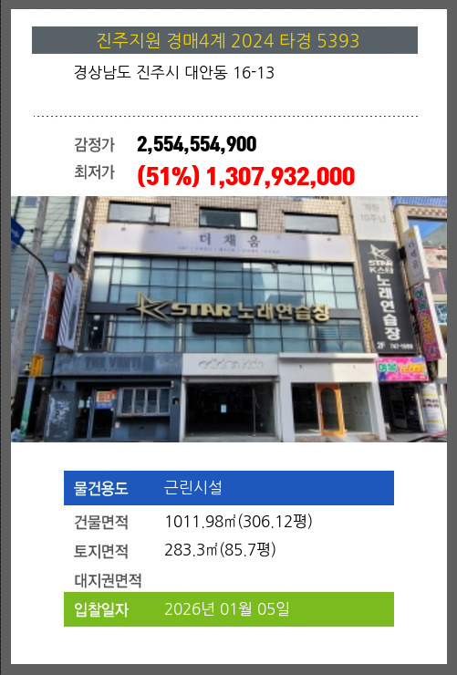 | 용도 | 근린시설 | 채권자 | 농** | 감정가 | 2,554,554,900 |