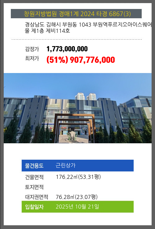 김해상가경매 김해시 부원동 1043 부원역푸르지오아이스퀘어몰 제1층 제비114호 №2024 타경 6867(3)