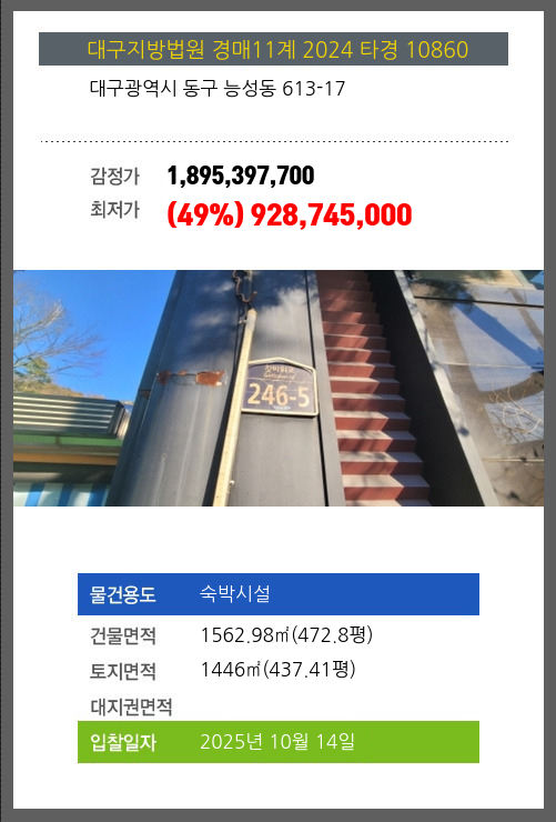 | 용도 | 숙박시설 | 채권자 | 공** | 감정가 | 1,895,397,700 |