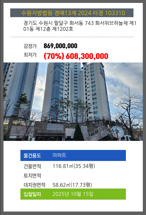 수원아파트경매 수원시 팔달구 화서동 743 화서위브하늘채 제101동 제12층 제1202호 №2024 타경 103310