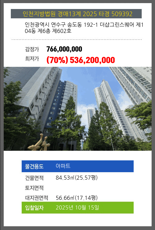 본건은 인천광역시 연수구 송도동 192-1 더샵그린스퀘어 제104동 제6층 제602호