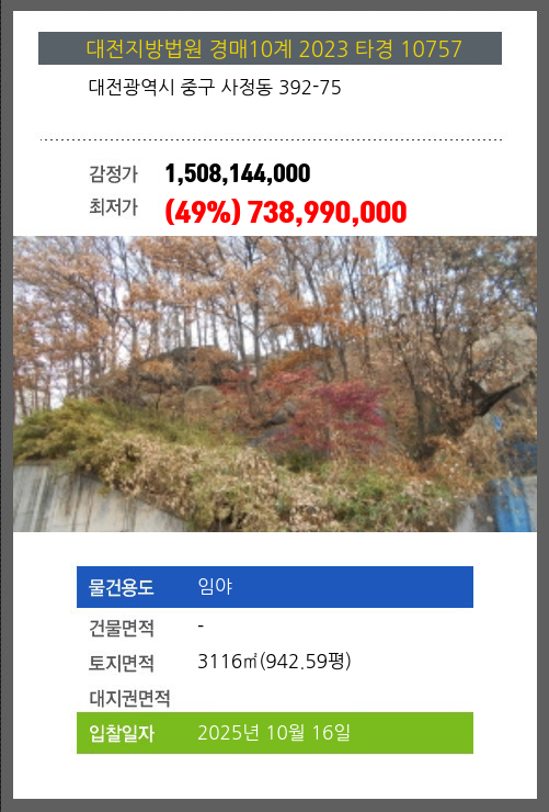 | 용도 | 임야 | 채권자 | 김**외1명 | 감정가 | 1,508,144,000 |