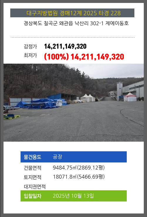 | 용도 | 공장 | 채권자 | 에** | 감정가 | 14,211,149,320 |