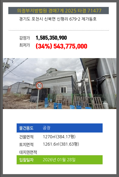 포천공장경매 포천시 신북면 신평리 679-2 제가동호 №2025 타경 71477