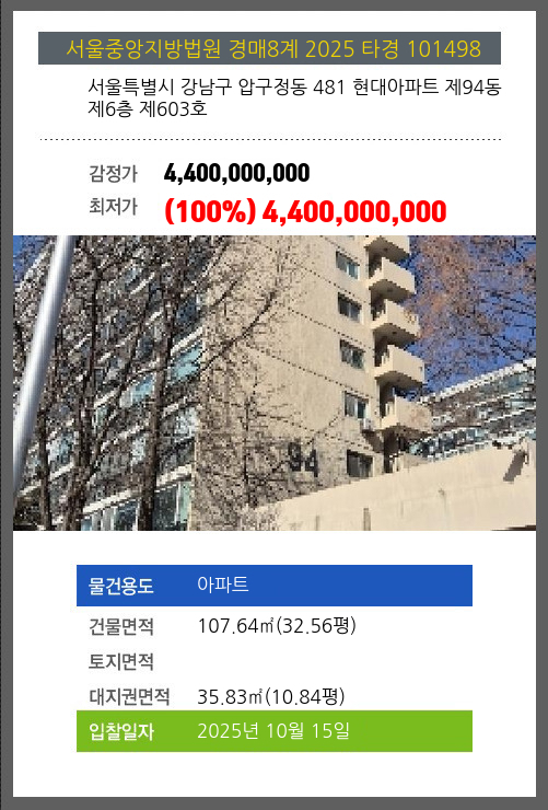 강남아파트경매 강남구 압구정동 481 현대아파트 제94동 제6층 제603호 №2025 타경 101498