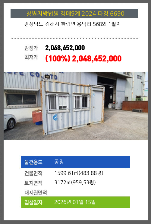 | 용도 | 공장 | 채권자 | 에** | 감정가 | 2,048,452,000 |