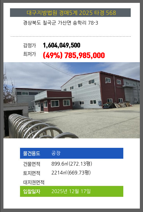 | 토지면적 | 2214㎡ (669.73평) | 소유자 | ㈜** | 보증금 | (10%) 78,598,500 |