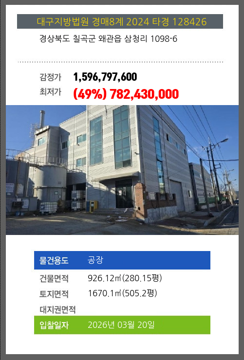 칠곡공장경매 칠곡군 왜관읍 삼청리 1098-6 №2024 타경 128426