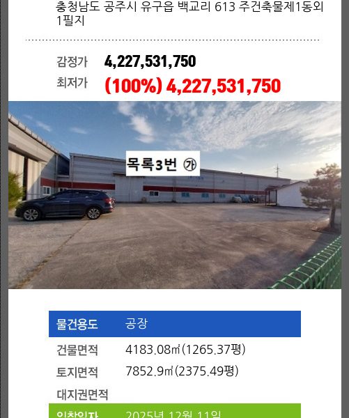 | 용도 | 공장 | 채권자 | ㈜** | 감정가 | 1,407,415,480 |