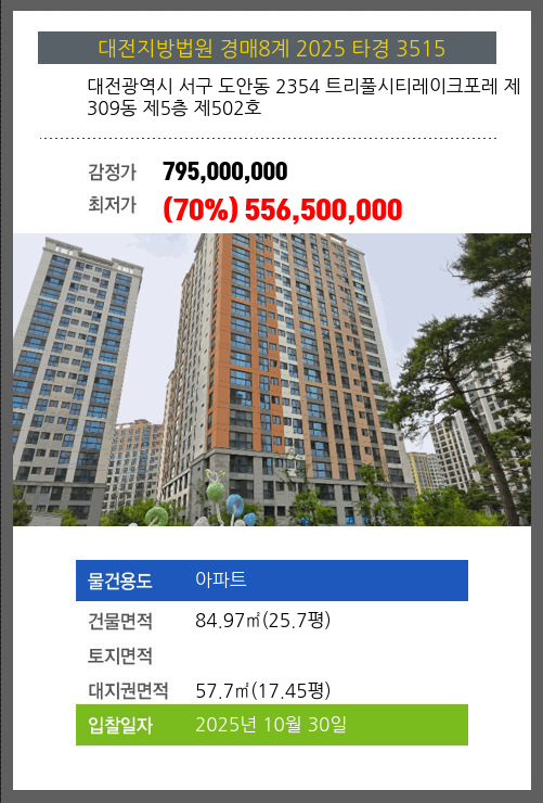 서아파트경매 서구 도안동 2354 트리풀시티레이크포레 제309동 제5층 제502호 №2025 타경 3515