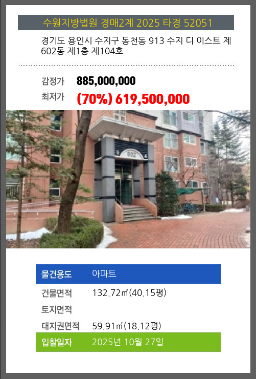 용인아파트경매 용인시 수지구 동천동 913 수지 디 이스트 제602동 제1층 제104호 №2025 타경 52051