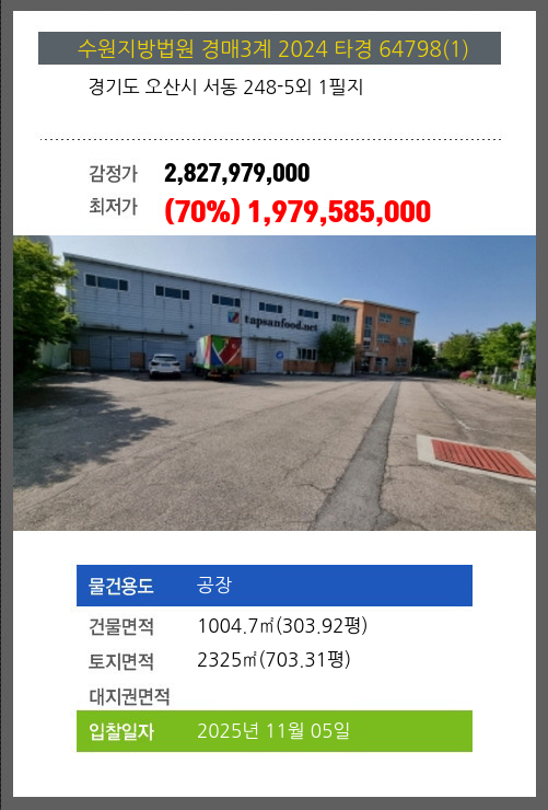 | 소재지 | [지번] 경기도 오산시 서동 248-5외 1필지 [도로명 주소] 경기도 오산시 서동로 103-8외 1필지 |