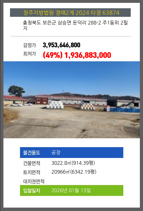 | 건물면적 | 3022.8㎡ (914.39평) | 채무자 | 대** | 최저가 | (49%) 1,936,883,000 |