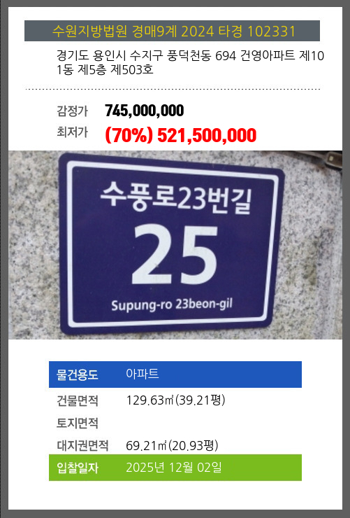 용인아파트경매 용인시 수지구 풍덕천동 694 건영아파트 제101동 제5층 제503호 №2024 타경 102331