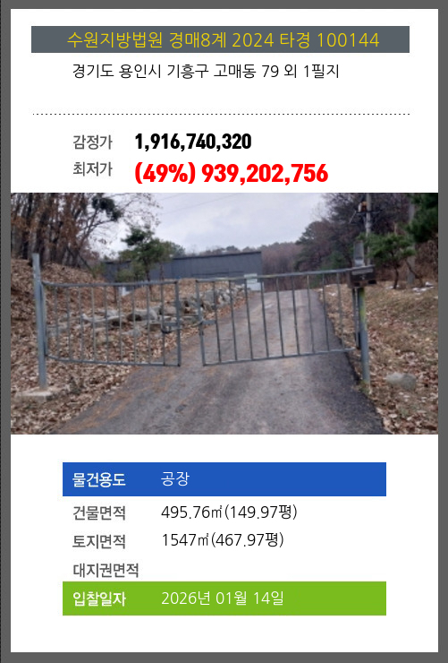 | 용도 | 공장 | 채권자 | 기** | 감정가 | 1,916,740,320 |
