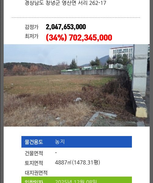 | 토지면적 | 4700㎡ (1421.74평) | 소유자 | 장** | 보증금 | (10%) 36,854,000 |
