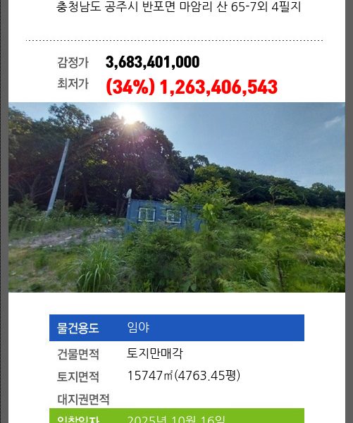 | 토지면적 | 7852.9㎡ (2375.49평) | 소유자 | ㈜** | 보증금 | (10%) 422,753,175 |