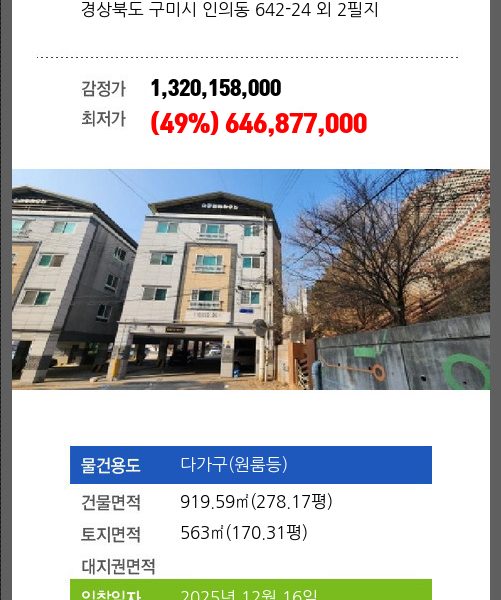| 용도 | 근린주택 | 채권자 | 북** | 감정가 | 851,505,480 |