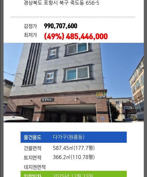 | 용도 | 다가구(원룸등) | 채권자 | 포** | 감정가 | 1,340,107,800 |