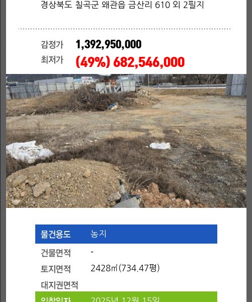| 토지면적 | 7959㎡ (2407.59평) | 소유자 | 정** | 보증금 | (10%) 361,410,520 |