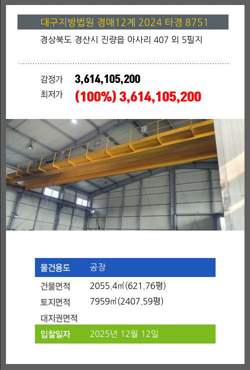 | 건물면적 | 2055.4㎡ (621.76평) | 채무자 | 정** | 최저가 | (100%) 3,614,105,200 |