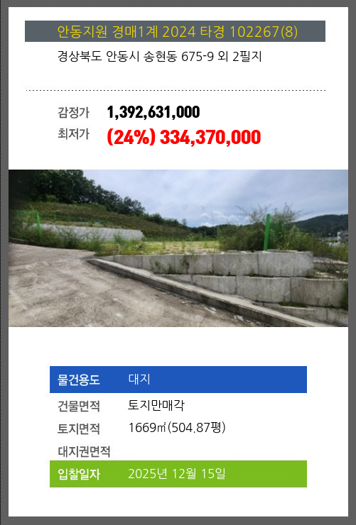 | 토지면적 | 1669㎡ (504.87평) | 소유자 | 거**외10명 | 보증금 | (10%) 33,437,000 |