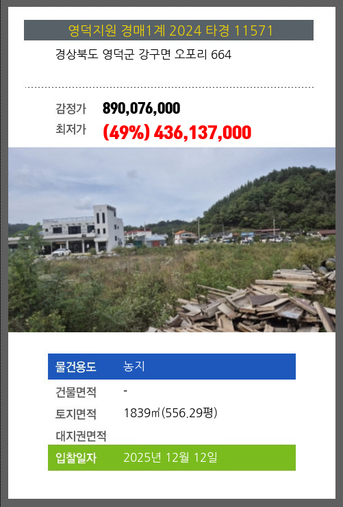 토지면적 1839㎡ (556.29평) 소유자 이** 보증금 (10%) 43,613,700
