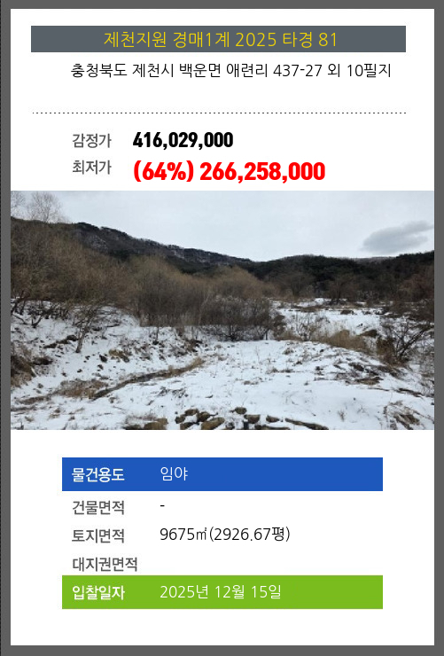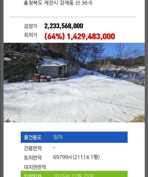 | 소재지 | [지번] 충청북도 제천시 백운면 애련리 437-27 외 10필지 | ||||