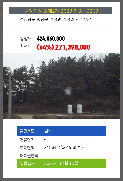 | 용도 | 임야 | 채권자 | 청** | 감정가 | 424,060,000 |