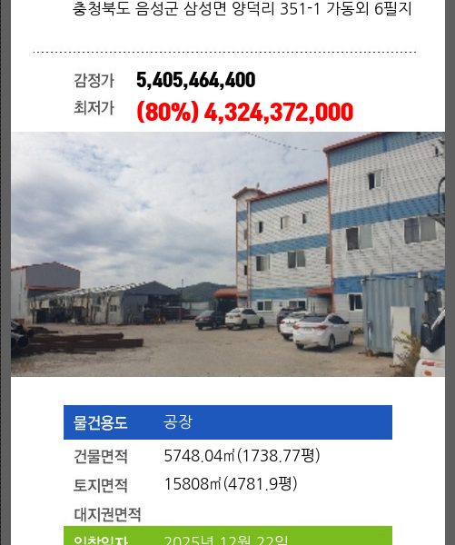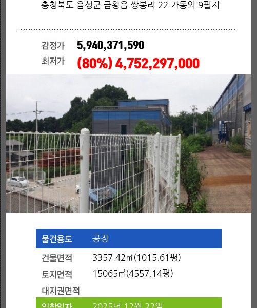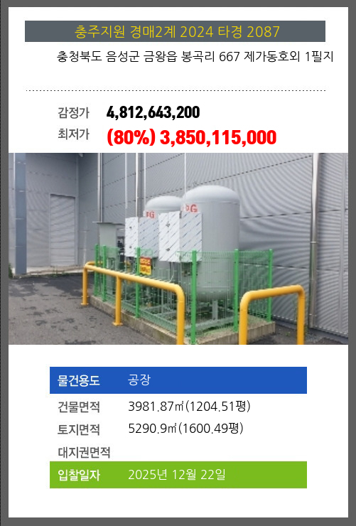 | 소재지 | [지번] 충청북도 음성군 금왕읍 봉곡리 667 제가동호외 1필지 [도로명 주소] 충청북도 음성군 금왕읍 오선산단로 22-20 제가동호외 1필지 |
