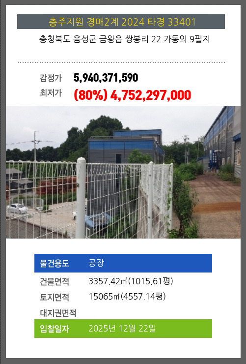 | 용도 | 공장 | 채권자 | 케** | 감정가 | 5,940,371,590 |