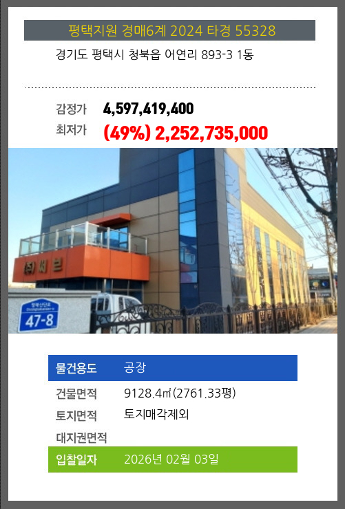 | 건물면적 | 9128.4㎡ (2761.33평) | 채무자 | ㈜** | 최저가 | (49%) 2,252,735,000 |