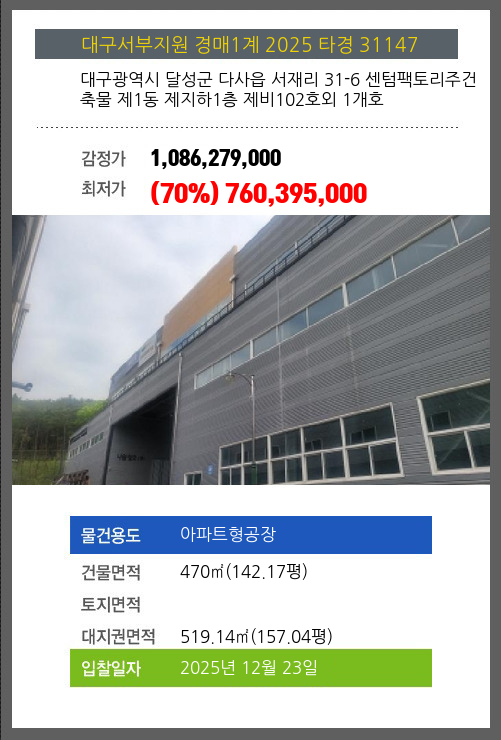 본건은 대구광역시 달성군 다사읍 서재리 31-6 센텀팩토리주건축물 제1동 제지하1층 제비102호외 1개호