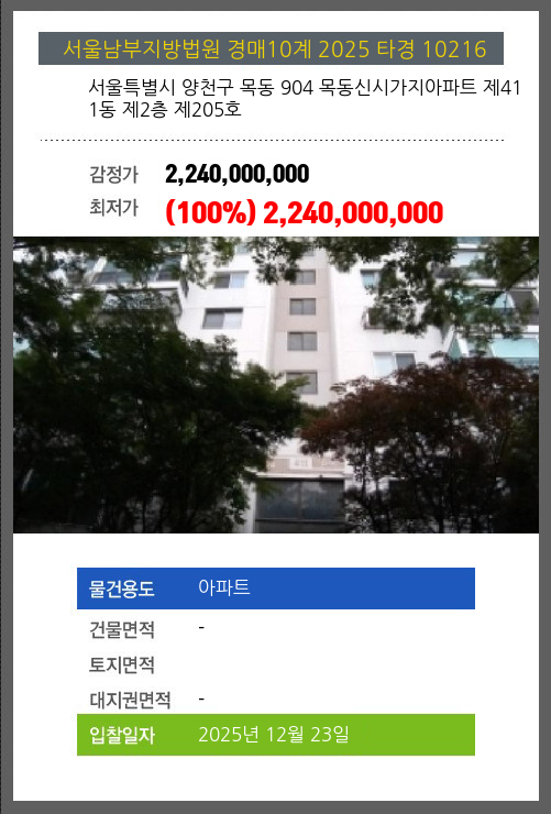| 용도 | 아파트 | 채권자 | 최** | 감정가 | 2,240,000,000 |