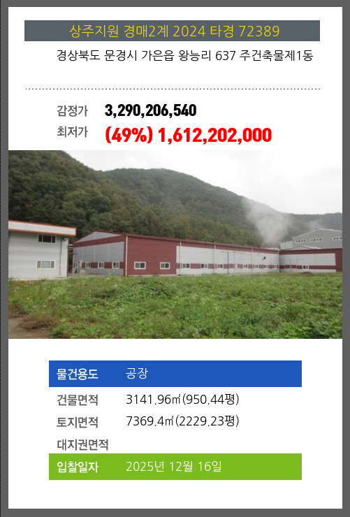 | 건물면적 | 3141.96㎡ (950.44평) | 채무자 | ㈜** | 최저가 | (49%) 1,612,202,000 |