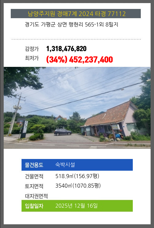 | 용도 | 숙박시설 | 채권자 | 가** | 감정가 | 1,318,476,820 |