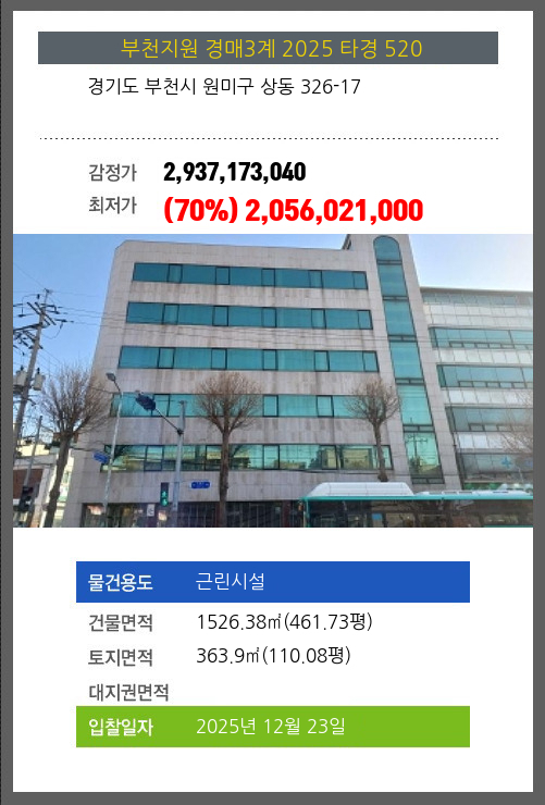 | 건물면적 | 1526.38㎡ (461.73평) | 채무자 | 김** | 최저가 | (70%) 2,056,021,000 |