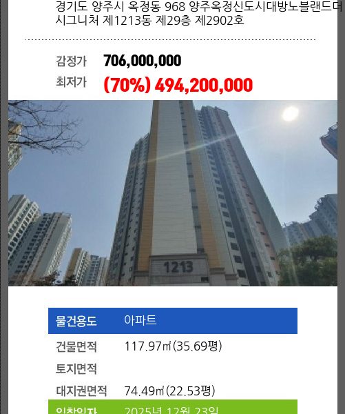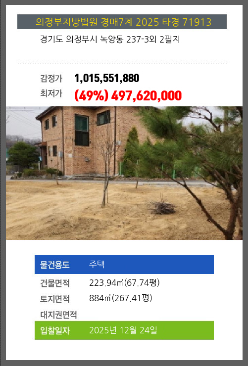 | 건물면적 | 223.94㎡ (67.74평) | 채무자 | 박** | 최저가 | (49%) 497,620,000 |