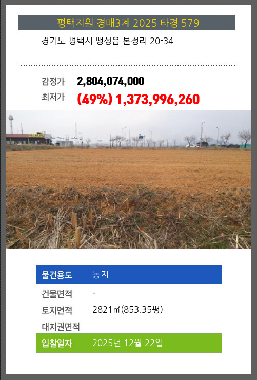 | 토지면적 | 2821㎡ (853.35평) | 소유자 | 김**외2명 | 보증금 | (10%) 137,399,626 |