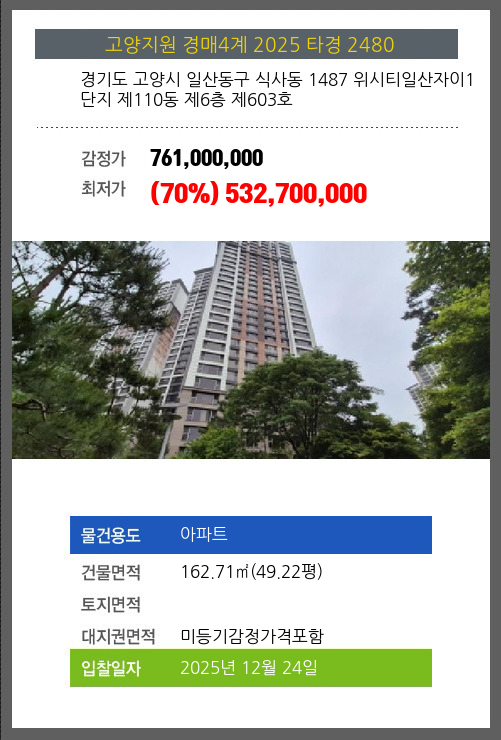 고양아파트경매 고양시 일산동구 식사동 1487 위시티일산자이1단지 제110동 제6층 제603호 №2025 타경 2480