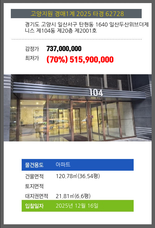 본건은 경기도 고양시 일산서구 탄현동 1640 일산두산위브더제니스 제104동 제20층 제2001호
