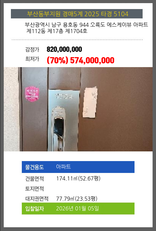 남아파트경매 남구 용호동 944 오륙도 에스케이뷰 아파트 제112동 제17층 제1704호 №2025 타경 5104