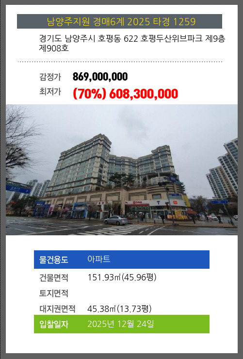 | 건물면적 | 151.93㎡ (45.96평) | 채무자 | 이** | 최저가 | (70%) 608,300,000 |