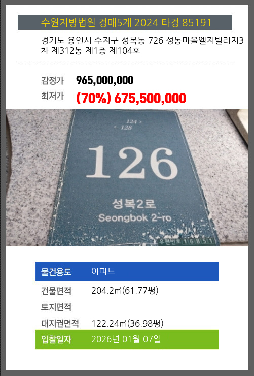 | 건물면적 | 204.2㎡ (61.77평) | 채무자 | 강** | 최저가 | (70%) 675,500,000 |