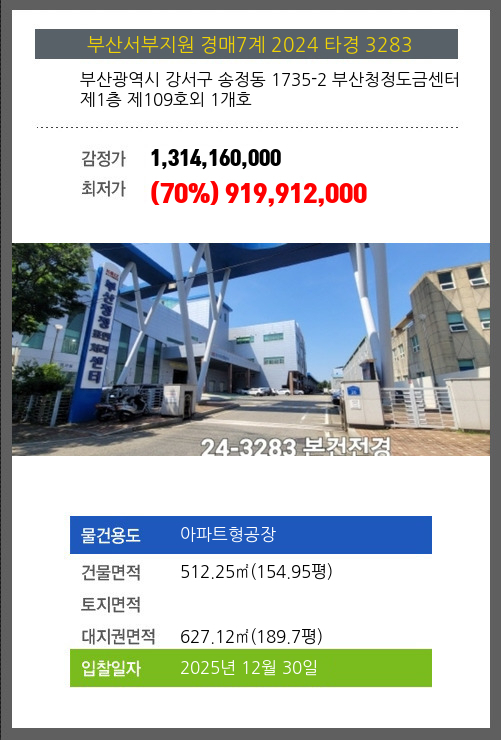 본건은 부산광역시 강서구 송정동 1735-2 부산청정도금센터 제1층 제109호외 1개호