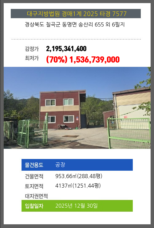 | 용도 | 공장 | 채권자 | 기**외1명 | 감정가 | 2,195,341,400 |