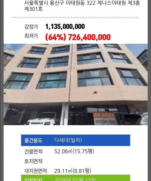 | 용도 | 주택 | 채권자 | 이** | 감정가 | 21,960,999,000 |